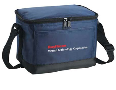 PEVA insulation. Zippered main compartment. Front open pocket. Adjustable shoulder strap. 6.625" H X 9" W X 6.125" L. 70d Nylon Qty Price SetUp Ship Total 120 $4.06 $50.00 $125.00 $662.21 510 $3.81 $50.00 $250.00 $2242.44 1020 $3.56 $50.00 $500.00 $4178.46 2500 $3.37 $50.00 $1200.00 $9671.90 Out to Lunch 6-Pack Cooler Bag