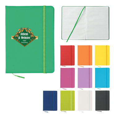 PVC cover, 80 sheets of paper. White, Yellow, Light Blue, Fuchsia, Kelly Green, Orange, Purple, Blue, Green, Red or Black. 1 color imprint included. Qty Price SetUp Ship Total 150 $2.50 $50.00 $76.00 $500.99 250 $2.39 $50.00 $125.00 $771.25 500 $2.34 $50.00 $250.00 $1468.50 2500 $2.21 $50.00 $750.00 $6331.25 5"x 7" Journal Notebook, ribbon & elastic strap