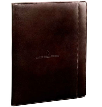 Interior organizer, front pocket, 8.5" x 11" pad Qty Price SetUp Ship Total 15 $42.38 $62.50 $18.00 $716.13 50 $39.95 $62.50 $75.00 $2134.87 100 $38.74 $62.50 $150.00 $4086.41 250 $37.53 $62.50 $300.00 $9745.87 Leather writing pad, top grain leather, debossed