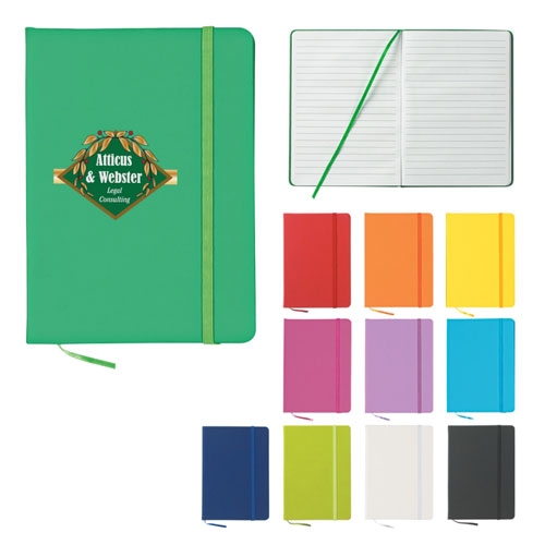 PVC cover, 80 sheets of paper. White, Yellow, Light Blue, Fuchsia, Kelly Green, Orange, Purple, Blue, Green, Red or Black. 1 color imprint included.