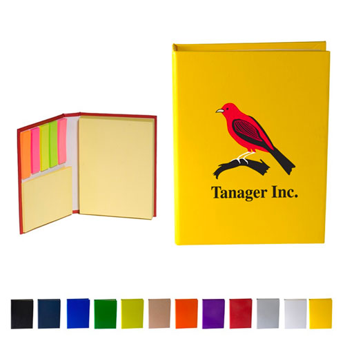 Sticky pads in three different sizes: 100 sheets 4" x 3" in yellow, 25 sheets 3" x 2" in yellow, and 25 sheets of page marker strips in five neon colors.