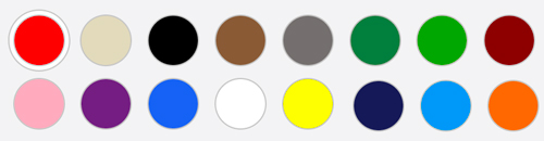 Purple, brown, orange, pink, almond, green, maroon, ocean blue, royal, black, midnight blue, light gray