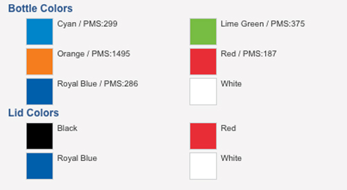 Premium low-density, Fill View Stripe. Mighty-Shot Valve Lid opens when you squeeze & reseals when you release for sanitary, hands-free hydration. BPA-Free. Bottle Colors: Cyan, Lime, Orange, Red, Royal, White. Lid Colors: Black, Red, Royal, White