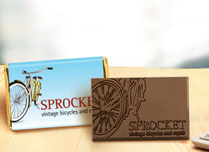 Belgian milk or dark chocolate, 2" x 3", (.75 oz) Qty Price SetUp Ship Total 250 $1.89 $100.00 $20.00 $592.46 500 $1.79 $100.00 $40.00 $1034.83 1000 $1.69 $100.00 $80.00 $1872.00 2500 $1.59 $100.00 $200.00 $4278.00 Chocolate bar, custom wrapper & molded chocolate