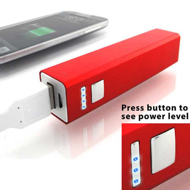 Charges your phone when you are out. 2200mAh. Black, teal, dark blue, silver, scarlet. Boxed. 2 color imprint Qty Price SetUp Ship Total 100 $7.49 $87.50 $30.00 $866.49 300 $6.88 $87.50 $90.00 $2242.46 500 $6.42 $87.50 $150.00 $3446.00 1000 $6.00 $87.50 $300.00 $6390.50 Power Bank 2400 with capacity indicator