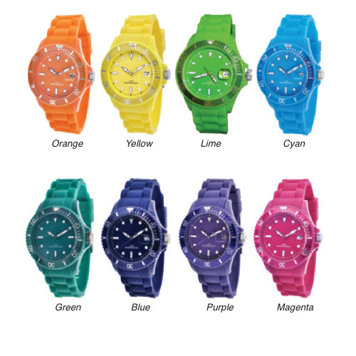 Quartz movement, 5 year warranty luminous hands,hours, date, adjustable bezel, stainless steel back . Red, black, white, orange, dark blue, light blue, yellow, green, lime, pink, purple