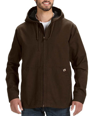 12 oz., 100% cotton quarry washed Boulder Cloth canvas, textured thermal lining, three-piece hood, zippered chest pocket, inside cell phone & patch pockets with snap closures