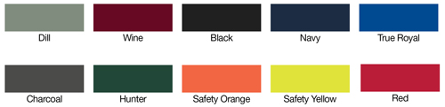 Black, charcoal, hunter, navy, orange, red, royal, yellow, wine.