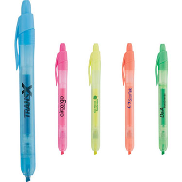 No cap to fumble. Yellow, green, pink, blue, orange. Qty Price SetUp Ship Total 250 $0.89 $45.00 $20.00 $287.49 500 $0.84 $45.00 $40.00 $506.86 1000 $0.78 $45.00 $100.00 $924.64 2500 $0.75 $45.00 $190.00 $2104.00 Retractable Highlighter with pocket clip.