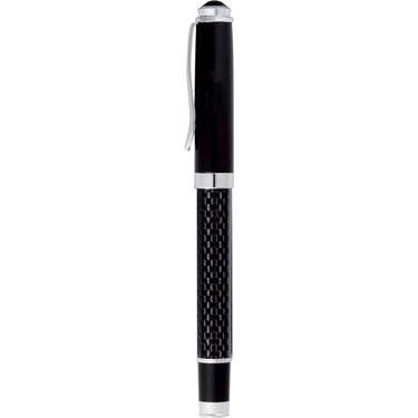 Gloss black upper, carbon fiber on lower barrel. Chrome accents. Premium ink. Gift box. Qty Price SetUp Ship Total 60 $7.98 $55.00 $18.00 $551.78 150 $7.69 $55.00 $30.00 $1239.15 300 $7.39 $55.00 $60.00 $2332.80 600 $7.19 $55.00 $120.00 $4489.95 Luna Roller Ball Pen, Cap off, Laser engraved
