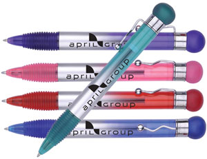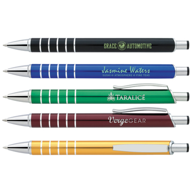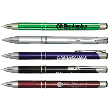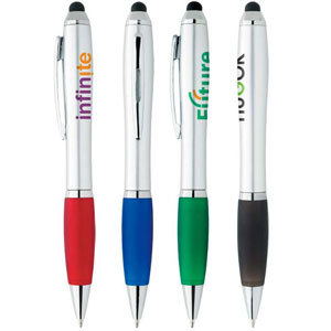 1 color imprint. Qty Price SetUp Ship Total 300 $0.68 $20.00 $15.00 $238.18 500 $0.65 $20.00 $30.00 $376.40 1000 $0.62 $20.00 $60.00 $700.16 2500 $0.59 $20.00 $150.00 $1638.80 Silver Stylus Pen, twist action, black, blue, green, red