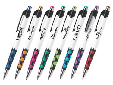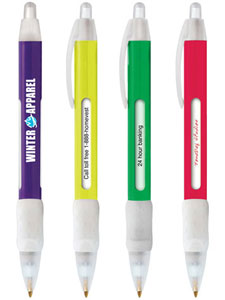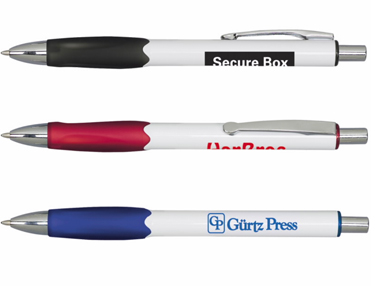 White with Black, Blue, Lime Green, Orange, Purple, Red or Yellow Trim. Qty Price SetUp Ship Total 500 $0.38 $40.00 $15.00 $247.15 1000 $0.35 $40.00 $28.00 $417.99 2500 $0.31 $40.00 $55.00 $861.50 5000 $0.29 $40.00 $110.00 $1620.00 Jada Pen, Rubber Grip, Plunger Action