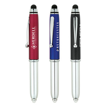 Colored cap, chrome barrel & trims with LED light & stylus. Black, blue, red. Qty Price SetUp Ship Total 200 $1.99 $50.00 $13.00 $460.84 500 $1.89 $50.00 $20.00 $1013.26 1000 $1.79 $50.00 $35.00 $1876.00 2500 $1.75 $50.00 $77.00 $4500.03 Ballpoint Pen / Stylus / LED Light. Printed.