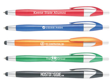 Brushed silver trim with ergonomic styling and a stylus tip, ultra-smooth writing cartridge. Qty Price SetUp Ship Total 500 $0.59 $15.00 $16.00 $323.80 1000 $0.56 $15.00 $28.00 $606.20 2500 $0.53 $15.00 $50.00 $1393.00 5000 $0.49 $15.00 $80.00 $2559.00 Javalina Metalic Stylus Pen