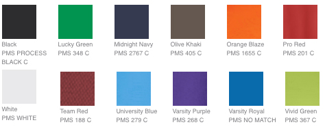 Vivid green, black, lucky green, navy, olive, orange, red, light blue, purple, royal, white. Embroidered.