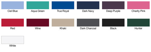 55% cotton, 45% polyester poplin. aqua green, black, charity pink, ciel blue, dark charcoal, dark navy, deep purple, hunter, khaki, red, true royal, white, wine. (XXS-5XL)