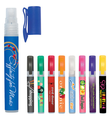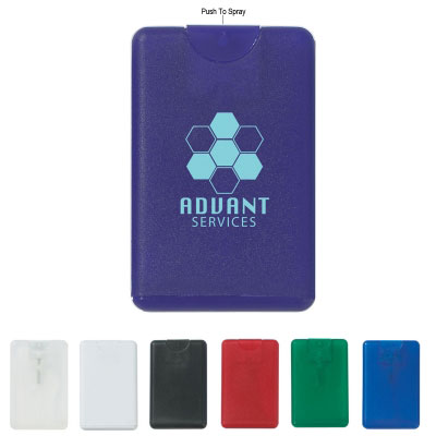 Lightly scented, push top spray. Clear, black, red, purple, blue, green, white. Qty Price SetUp Ship Total 300 $1.44 $40.00 $30.00 $503.26 1000 $1.39 $40.00 $85.00 $1512.65 2500 $1.30 $40.00 $170.00 $3450.75 5000 $1.24 $40.00 $335.00 $6595.50 Hand Sanitizer Spray, card shape, .66ml, Printed