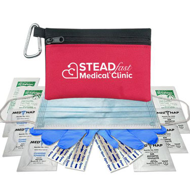 Contains nitrile gloves, face mask, three hand sanitizer packets, four adhesive bandages, three antiseptic towelettes, three wash-up towelettes. Blue, charcoal, lime green or red with black Qty Price SetUp Ship Total 100 $4.75 $55.00 $17.00 $546.53 250 $4.50 $55.00 $48.00 $1228.75 500 $4.25 $55.00 $82.00 $2260.25 1000 $3.99 $55.00 $144.00 $4189.00 PPE Zip Tote Personal Protection Kit