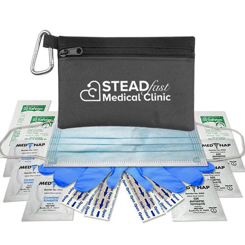Contains nitrile gloves, face mask, three hand sanitizer packets, four adhesive bandages, three antiseptic towelettes, three wash-up towelettes. Blue, charcoal, lime green or red with black